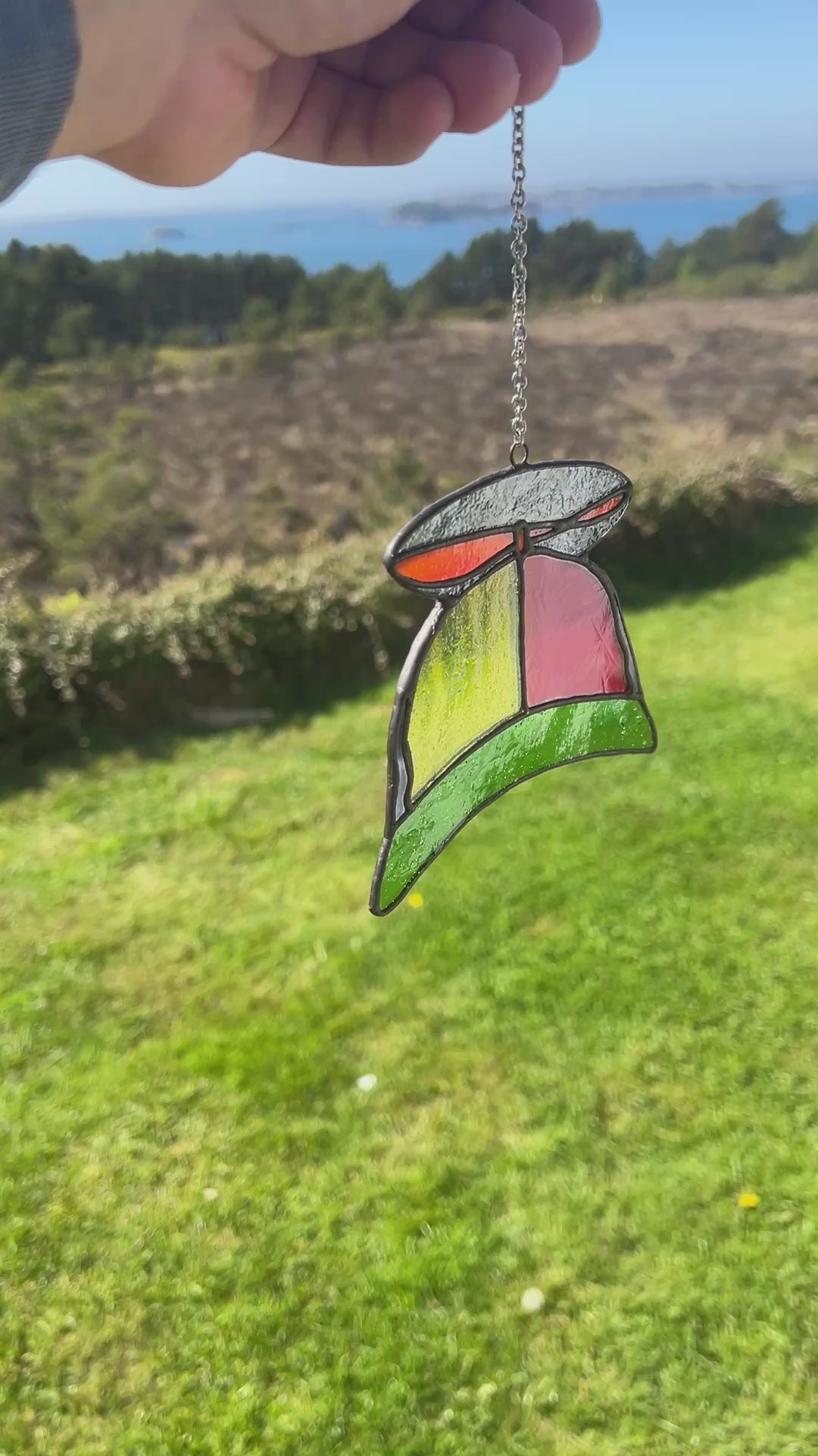 This is a Stained glass mobile, a dynamic suncatcher that spins like the brave propeller.